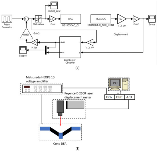 (a) The basic linear quadratic regulator controller; (b) A Luenberger observer; (c) An LQR controller having a Luenberger observer; (d) a plant model detail for the cone DEA; (e) LQR controller for real-time closed-loop experiment; and, (f) Block diagram for the experimental setup for the control of the cone DEA.