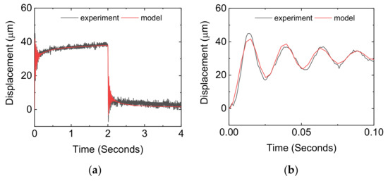 The identified model was compared with its experimental data, as shown in Figure 3a,b, where the matching was very close. Figure 3a shows the comparison for the first voltage ON and OFF cycle, where overshoot is apparent at both the voltage ON and voltage OFF instances. A close-up of the first 100 ms reveals that the DEA shows a peak overshoot at 12 ms, as shown in Figure 3b. By comparing the first peak amplitude with the final value assumed at 100ms, the peak overshoot was 50% and the rise time was 10 ms. The viscoelastic relaxation phenomenon was observed on this DEA under an applied constant voltage of 1000 V, for 70 s (Figure 3c). Further, on voltage OFF, the DEA had an overshoot followed by a long period of about 70 s for the DEA to return to its initial condition. This is a creep phenomenon and is an inherent material property of rubber [33]. The removal of creep has not been our objective; we aim to eliminate the overshoot to zero percent, keeping the rise time to less than 30 ms, while assuming a final value to be at 100 ms.