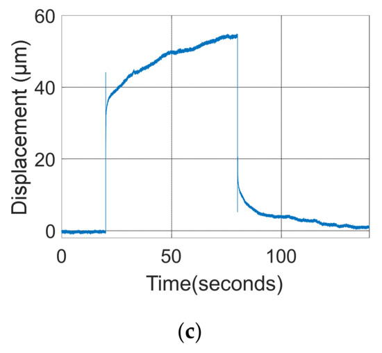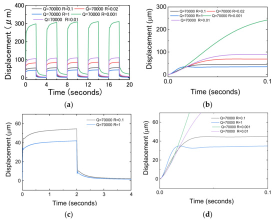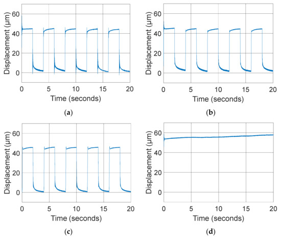 Figure 7 shows the experimental results for the effect of varying R when Q = 70,000. When R = 1 (Figure 7a), overshoots are pronounced at both voltage ON and OFF instances. This performance of the DEA is similar to the open-loop performance of Figure 6e, implying that R = 1 did not mitigate much the DEA’s aggressive response. For R = 0.1 (Figure 7b) and 0.01 (Figure 7c), no overshoots can be seen at the voltage OFF instances. However, when R = 0.001 (Figure 7d), the DEA does not return to the initial position. The optimal performance is when Q = 70,000 and R = 0.1 judging from the peaks of Figure 7b,c (Figure 7b).