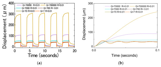 Q was varied between 7 and 700,000 while R was kept constant at 0.01 to investigate the effect of varying Q on the response of the DEA (Figure 4). In Figure 4a, a large value of Q = 700,000 resulted in the largest stroke of up to 300 µm, while the Q value of 7 resulted in about 35 µm of displacement. Therefore, a larger value of Q while holding R resulted in a larger displacement. Figure 4b shows a close-up of Figure 4a for the responses for the first 100 ms, while assuming the final values to be at 100 ms. Q = 7, recorded the lowest displacement, the fastest rise time (< 10 ms), largest overshoot and aggressive response similar to the open-loop behavior in Figure 3b, while the Q = 700,000 had a damped response (rise time = 75 ms) and no overshoot (Figure 4b).