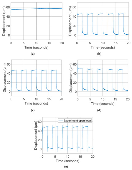 Figure 6 shows the effect of varying Q when R = 0.01. At Q = 700,000 (Figure 6a) the DEA does not return to the initial position during the voltage OFF cycle. At Q = 70,000 (Figure 6b) and Q = 7000 (Figure 6c), small overshoots can only be observed at the ON instances. For Q = 700 (Figure 6d) overshoots are observed in both the voltage ON and OFF phases. Theoretically, the DEA should have very high displacement if allowed to be driven by voltages higher than 1100 V, as can be seen from the simulation results of Figure 4a where the value of Q = 700,000 and R = 0.01 resulted to a DEA displacement of 300 µm. For this LQR controller, the saturation limit was set at 1100 V to prevent the DEA from voltage breakdown. In our experiments, when the DEA is overdriven, it persists in one position of 55 µm because of the saturation limit. From the experiments data, the graphs with no overshoots at the voltage OFF instances had Q = 70,000 and 7000 when R = 0.01. The open-loop response of Figure 6e shows overshoots and a similar response to Figure 6d when Q = 700. This means that a low Q value had little effect in minimizing the aggressiveness of the DEA’s response. We select Figure 6c to be the optimal performance judging from its overshoot at the voltage ON instances being very small, with Q = 7000 and R = 0.01.