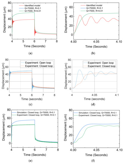 The LQR controller that was used in the simulation was implemented for the closed-loop experiment, as shown in Figure 2d. The effect of Q and R on the DEA performance was experimentally investigated. First, Q was varied and run, followed by R. An open-loop experiment was performed together with the closed-loop experiments for a comparison of the performance of the LQR controller. For the closed-loop experiment, a square voltage, the same as the one used for obtaining the input-output data, was given as command voltage. Therefore, overshoot can be eliminated by optimally tuning Q and R. The simulations guide the choices of Q and R for these experiments.