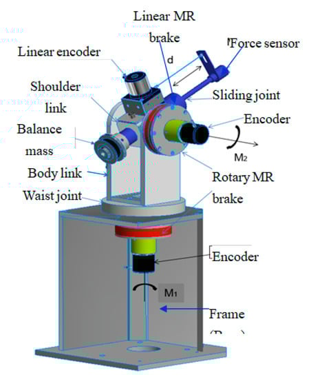 Magnetorheological (MR) materials are a class of smart composites prepared by dispersing nanometer- or micrometer-sized ferromagnetic fillers into different carrier matrices. As the rheological properties can be controlled by an external magnetic field rapidly, reversibly, and continuously, magnetosensitive smart materials have great application potential in construction, automotive industry, artificial intelligence, etc. Depending on the carrier matrix material, different types of MR materials can be composed such as MR fluid [,], MR elastomer [,], MR gel [,], MR foam [,] and MR grease [,]. In order to create a better desired feedback force, actuators featuring magnetorheological fluid (MRF) have been recently implemented [,,,]. These research studies showed that MRF-based actuators are very potential candidates for haptic applications. Recently, a 3-DOF haptic system featuring an anthropomorphic (elbow) manipulator and three MR brakes was developed by Nguyen et al. []. In the haptic tele-manipulator system developed by Nguyen et al., a commercial 3-DOF elbow manipulator was used as a slave manipulator while the haptic master manipulator had similar kinematic chain with the master, integrated three rotary MR brakes at the three joints to generate a desired force to the operator. The required torque at the joints of the haptic master was determined from the desired force based on static modeling of the manipulator. In order to achieve the required torque, a PID (Proportional-Integral-Derivative) controller was employed for each MR brake. Obviously, in the static modeling, the dynamic behavior of the manipulator was not accounted for. In addition, the friction was also neglected. Therefore, the calculated torques were not accurate required values, resulting in an inaccuracy of the feedback force. To improve the force feedback accuracy, Nguyen et al. [] recently carried out some modifications, in which the required torques of the MR brakes were estimated based on the measured values of currents were applied to the armatures of the slave’s servo motors. The experimental results showed that the accuracy of the feedback force was significantly improved compared to those presented in the case of []. An implicit disadvantage of a force feedback system using an articulated manipulator mechanism is that the required torques are determined from coupled equations, resulting in implicit values of the required torques. In order to solve the implicit torque calculation of the articulated manipulator-based force feedback, Nguyen el al. [] proposed a force feedback system based on a spherical arm mechanism, in which two rotary MR brakes and a linear MR brake were employed to feedback a desired 3-DOF force to the operator. With the proposed configuration, a 3-DOF desired force acting on the master operator can be achieved by independently controlling the current applied to the coils of the MR brakes with this configuration.