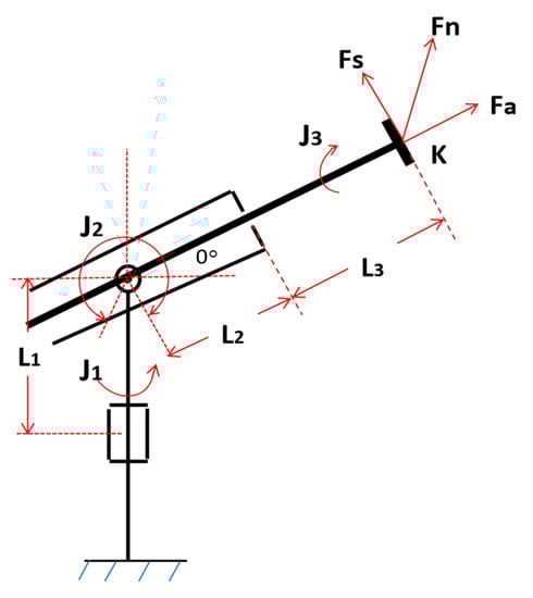 In this section, the configuration of the proposed 3-DOF force feedback system is shown in Figure 1. As can be seen, the system consists of a spherical arm mechanism with three joints—the waist revolute joint, the shoulder revolute joint, and the arm prismatic joint. On the shaft of the waist joint, a rotary MR brake is employed to reflect a desired horizontal tangent force. The housing of the brake is fixed to the body frame of the spherical arm, while its shaft is assembled to the joint shaft. On the other end of the brake shaft, an encoder is attached to measure the angular position of the body part of the master (azimuth angle). On the body part, the shoulder joint is installed. On the shaft of the shoulder joint, another rotary MR brake is installed to reflect a desired elevation tangent force. The housing of the brake is fixed to the body link while the brake shaft is connected to the shaft of the shoulder link. The other end of the brake shaft is connected with an encoder to measure the angular position of the arm link (elevation angle). The linear MR brake is installed on the shoulder link which is connected to the shaft of the shoulder joint. The outer housing of the linear MR brake is fixed inside the hole on the shoulder link while the shaft can move back and forth as a sliding arm. At the end of the shaft, a 3-DOF force is employed to measure the force acting on the operator. In order to measure the position of the sliding arm (radial length), a linear encoder is used. The simplified kinematic chain of the force feedback system is shown in Figure 2.