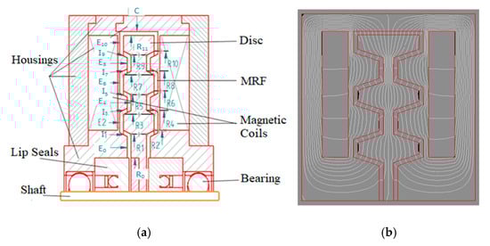 In this study, a novel MR brake with tooth-shaped rotor, shown in Figure 4, is proposed for the rotary MR brakes. As shown in Figure 4a, the brake disc (rotor) made of magnetic steel is fixed to the flange of the shaft made of nonmagnetic steel. The disc is installed inside a stationary envelope (housing). The housing is also made of magnetic housing. The gap between the disc and the housing is filled up with MR fluid. Two magnetic coils are placed on two sides of the brake housing to generate a magnetic field running across the MRF gap. It is to be noted that, to create a mutual magnetic field inside the brake structure, two counter currents are applied to the coils. The tooth-shaped counterpart faces of the disc and the housing allow a large contact surface between the MRF and the disc, thus the induced braking torque is expected to increase notably. Figure 4b shows simulated magnetic flux lines of the MR brakes obtained from ANSYS when two counter currents are applied to the coils.