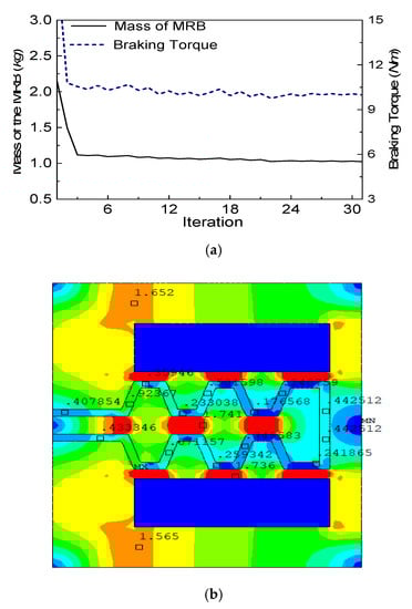 Optimization solution of the rotary MR brakes. (a) Mass and braking torque. (b) Magnetic flux density of the brake at the optimum.