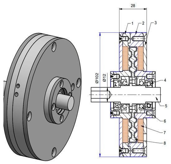 From the figure, it can be seen that the convergence occurs after the 30th iteration, at which point the mass of the MR brake is 1.03 kg. The distribution of magnetic density is shown in Figure 6b. At the optimum, the values of design variables and performance of the MR brakes are shown in Table 1. It is to be noted in Table 1 that the thickness of the disc reached its lower limit at the optimum. From the optimal results, a detailed design of the MR brakes was carried out, and its assembly drawing is shown in Figure 7.