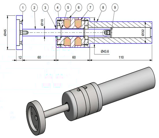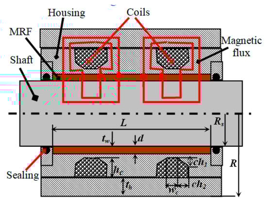 In order to create a desired force in the radial direction, a two-coil linear MR brake without using a non-magnetic bobbin developed by Song et al. [] shown in Figure 8 was used. The braking force of the linear MR brake can be determined by the following: