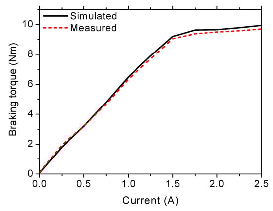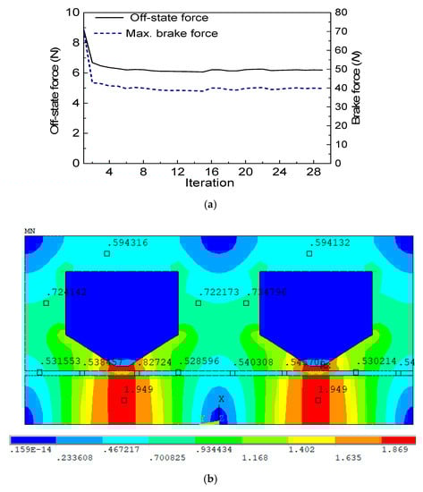 The optimal solution of the MR brake, where the maximum induced braking torque was constrained to be greater than 10 Nm (the required is 8 Nm) and convergence rate was set as 0.1%, is shown in Figure 6a.