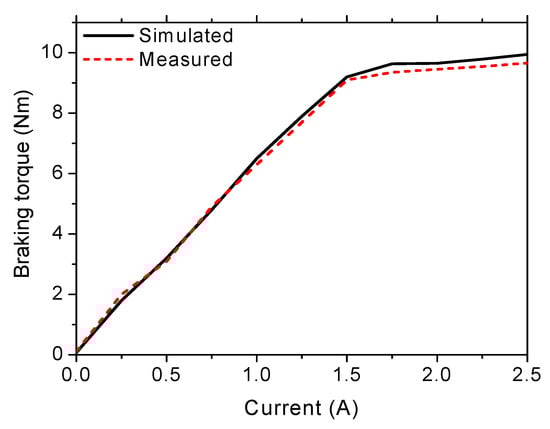 The optimal solution of the MR brakes was obtained based on the first-order optimization method using the steepest gradient decent algorithm integrated in the ANSYS optimization toolbox [,]. In the optimal design problem, important parametric dimensions of the MR brakes such as the height and width of the coil (hc, wc), the disc outer radius R0, the inner tooth radius R1, the geometric dimensions of the tooth (height, top thickness, bottom thickness), the disc thickness td, the outer housing thickness to, and the side housing thickness th were chosen as design variables. Noteworthily, a small gap size of the MRF duct results in a high braking torque. However, the small gap size causes a large value of the off-state braking torque that degrades performances of the MR brakes, such as high dissipated energy, overheating, and a particularly inaccurate feedback force due to the high value of the uncontrollable force. In addition, a small gap size of the MRF ducts results in cost and difficulty in manufacturing. important issues that should also be accounted for. Based on the above, the MRF gap size was not considered as a design variable but was empirically determined, being 0.6 mm in this research. The thin-wall thickness of the coil was also not considered as a design variable. It should be as small as possible to block magnetic flux going through but to force the magnetic flux going across the MRF gap. Considering manufacturing aspects, the thin-wall thickness of the coils was set as 1 mm. In this research work, the medium induced yield stress MRF made by Lord Corporation (MRF132-DG) was used and the copper coil wire was sized as 24-gauge (diameter = 0.511 mm, maximum working current is around 3 A). However, during the optimization process, a current of 2.5 A was applied to the coil to take safe working conditions into consideration. It is also to be noted that the filling ratio of the coil was set as 0.7, while magnetic loss was assumed to be 10% based on empirical experience.