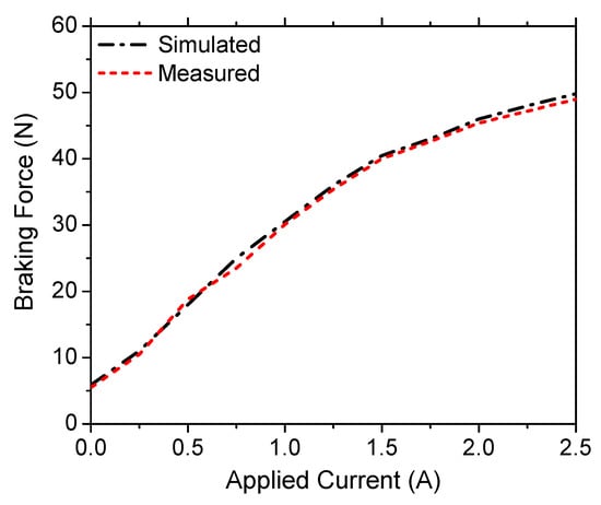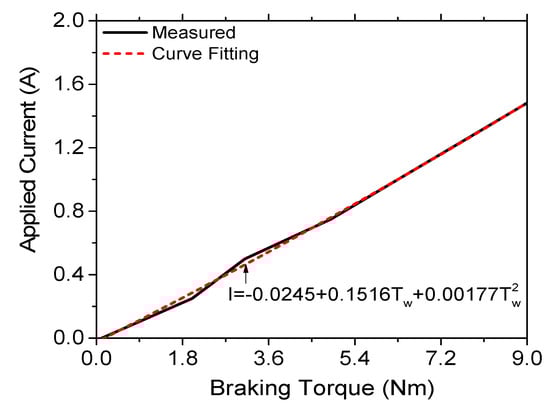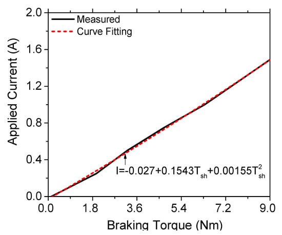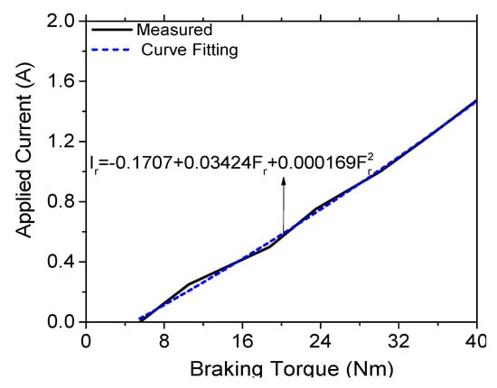 For the radial force, as shown in Figure 17, from the desired radial force, the applied current to the coils of the linear MR brake was determined from the experimental results shown in Figure 15. Similar to the rotary MR brake, only applied current smaller than 1.5 A was used for the linear MR brake, as shown in Figure 20. Using parabolic curve fitting, the current applied to the coils of the linear MR brake was determined by Equation (14):