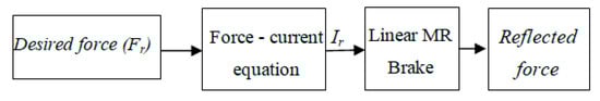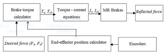 In this section, the open-loop controller is presented, which was designed to reflect a desired force to the operator. Figure 16 shows the block diagram of the control system for the horizontal and elevation tangent forces, whereas that for the radial force is shown in Figure 17. As shown in Figure 16, from the information of the encoders, the values of elevation angle (θ) and arm radius r were determined. The braking torque of the waist MR brake was then calculated by Equation (10), whereas that of the shoulder brake was calculated by Equation (11):
