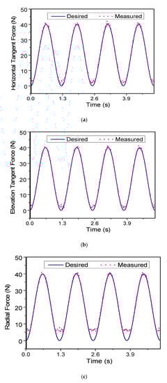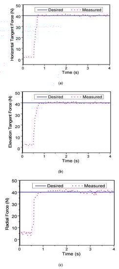 Figure 22a shows that the actual feedback horizontal force agrees well with the desired one, with a maximum error of 4% obtained at steady state and a response time of approximately 0.24 s. From Figure 22b, it is also be seen that the actual feedback elevation force agrees well with the desired one. In this case, the response time is approximately 0.26 s. From Figure 22c, it can be seen that the actual feedback radial force agrees quite well with the desired one, with a maximum error of approximately 6.5% and with more fluctuation than previous ones.