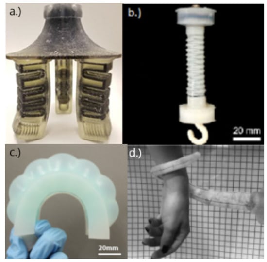 Another great soft robotic material is the 3D printed material as shown in Figure 9. 3D printed soft robots can be easily mass produced, and due to the cost-effective material more soft robots can be produced []. The drawback for a 3D printed material for a soft robotic part is that the tensile strength of the part is very low, and thus can break very easily as opposed to other materials for soft robotic parts []. However, with the advent of better 3D printing machines, new advances have been made to increase the tensile strength of 3D printed materials for soft robotics [].