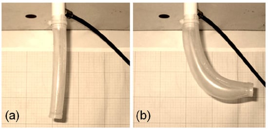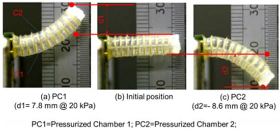 Bi-bellows bending actuator manufactured using silicone rubber (a) is unpressurized, (b) is pressurized []. (Copyright 2011, Elsevier.)
