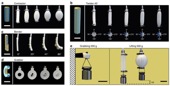 - Schaffner, M.; Faber, J.A.; Pianegonda, L.; Rühs, P.A.; Coulter, F.; Studart, A.R. 3D printing of Robotic Soft Actuators with Programmable Bioinspired Architectures. Nat. Commun. 2018, 9, 878. [Google Scholar] [CrossRef]