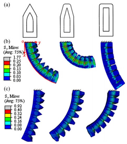 FEA model of a soft robotic actuator compared to experiment []. (a) Schematic of the chamber shape, (b) The maximum bending angles of the three actuators when deflated, (c) The FEA results of the three actuators at pressurization state (20 kPa). (Open Access).