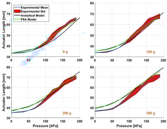 Figure 13, Figure 14 and Figure 15 show the accuracy of computationally efficient models to experimental results of soft robotic actuators. In this case to make the FEA model computationally viable, the silicone rubber was assumed to be incompressible and the helical thread surrounding the silicone to be a radial constraint rather than a helical constraint []. Even with those approximations made to the FEA model, Figure 13 shows the ability of FEA modeling techniques to represent the reverse pneumatic artificial muscles (rPAM) effectively. This viability of FEA models to predict the nature of the design will allow for more complex, intricate and economically viable designs to be accurately modeled in the future [].