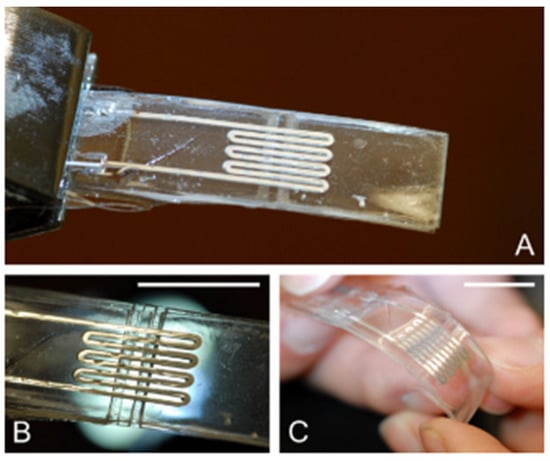 Different views of a liquid metal embedded elastomer curvature sensor. (A) An overview of the sensor, (B) a close-up of the liquid metal filled channels in the sensor, (C) the sensor is able to flex and stretch without breaking [] (Open Access).