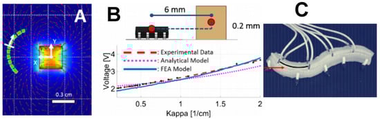 The function of a hall effect sensor in an EMS (A), the distance between the magnet and hall effect sensor in the curvature sensor presented by Ozel et al. (B), and the data correlating the accuracy of the models to the curvature sensor design (C) [] (Open Access).