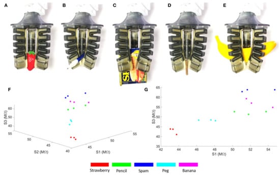 3D multi material prints can be leveraged to create embedded sensors within soft robotic actuators capable of holding many different objects (A–E), 3D perspective of the scatter plot (F) and 2D perspective of the scatter plot (G) []. Another similar project was completed in 2015 by Homberg et al. [] and again in 2019 by Truby et al. [] (Open Access).