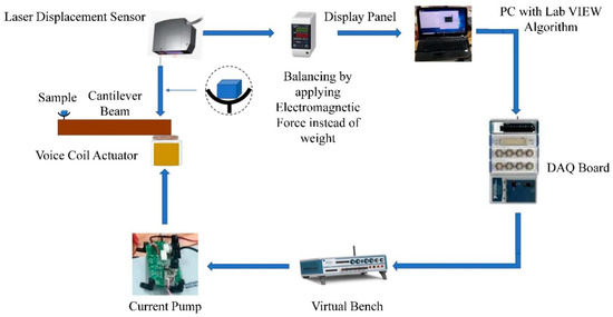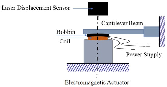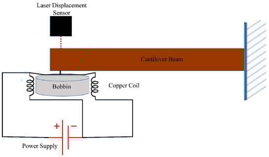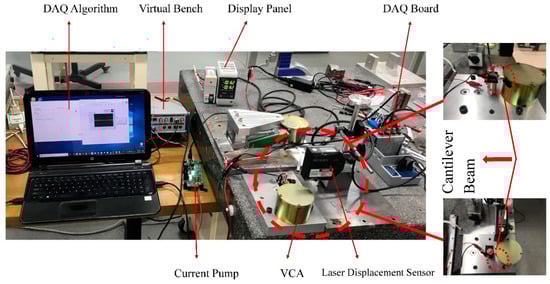 Figure 12 shows the experimental setup of the voice coil actuator to estimate the system parameters. The parameters with and without the VCA were investigated experimentally and theoretically. The cantilever beam deflection was detected by a laser displacement sensor as we provided input voltage from the data acquisition (DAQ) algorithm, which is amplified using NI virtual bench by generating the input current to operate the VCA.