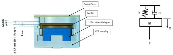 is the Lorentz force basic operating principle of VCA as the current, , flow in the coil produces such force; is the mass of attached bobbin, is the electromagnetic damping, and is the spring constant of a cantilever beam.