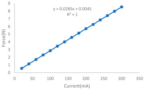 For different current values, a different magnetic force was generated to determine the force–current relationship of the voice coil actuator. The experimental results are shown in Table 3 and a regression analysis can be seen in Figure 9.