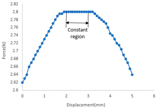 Force is different according to the distance of the bobbin from the center of the coil length even under the same current. According to the Lorentz law, the generated force does not vary linearly with a constant operating region for constant input, which means that the magnetic flux density does not act uniformly when reporting the position of the constant operating region. Due to this phenomenon, achieving precise constant motion is difficult. Figure 10 shows the experimental results of the thrust force (F) depending on the bobbin location when a constant current was supplied to the VCA. This indicated that the proper operating region is limited to from its center if the force is linear in the input current of the .