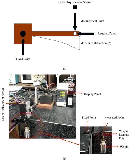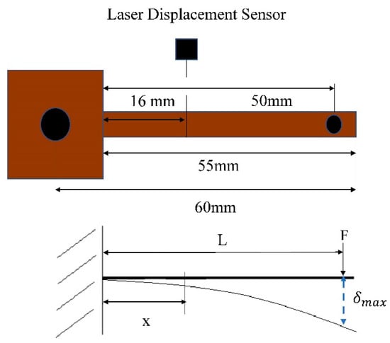 Figure 13 represents the laser sensor scenario as we record the deflection of the beam at the middle of the fixed and loading point, which is equal to . Therefore, we recorded the deflection from a particular point using a laser displacement sensor. From that point, we want to know the full deflection of the cantilever beam using cantilever beam deflection theory to find the unknown deflection at the measurement point to compare with the theoretical deflection and deal with the spring constant .