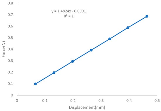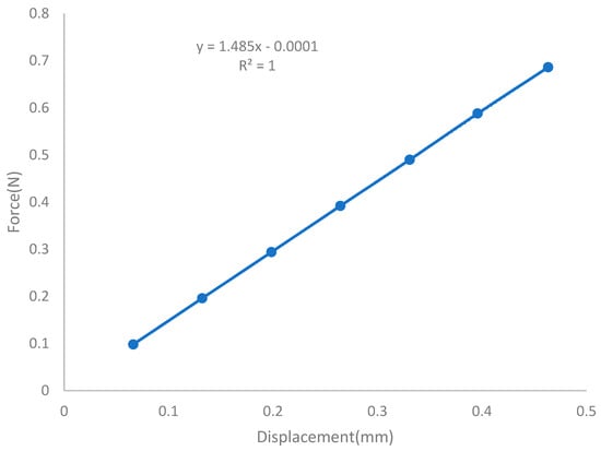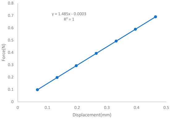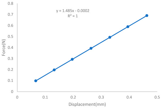 Based on the experimental and theoretical results shown in Table 4, a linear regression analysis of the force vs. the displacement was performed, indicating the spring constant of 1.485 N/mm in Figure 14 and Figure 15.