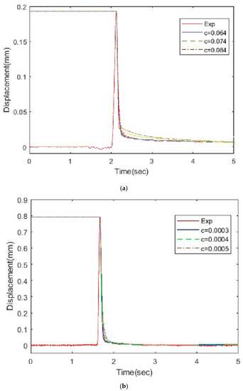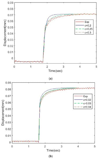 In contrast, for the non-conductive material case, the same procedure applied as for the conductive material case. The experimental responses with different values were compared by checking the damping coefficient with 0.02, 0.03, and 0.04; the system responded most adequately with , which corresponds to the damping ratio of 0.048, as shown in Figure 20b.