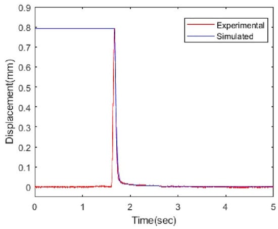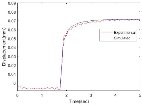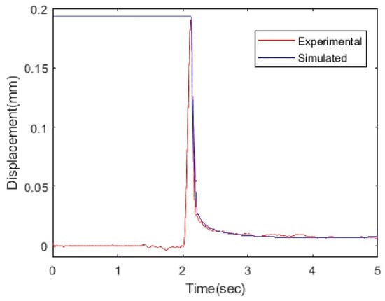 Similarly, without the VCA, the cantilever beam was pushed and released for the conductive and non-conductive material cases and a similar procedure was followed to compare the experimental results with the simulated results. The best-estimated damping coefficient with a corresponding damping ratio of for the conductive material and with a damping ratio of for the non-conductive material are shown in Figure 21b (right for the conductive material and left for the non-conductive material). Therefore, we concluded that it was also over-damped despite showing a fast time response.