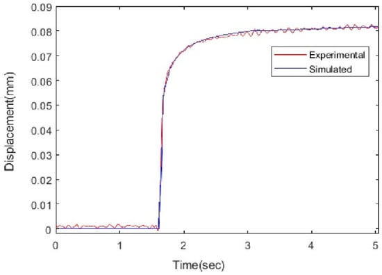 For the VCA with the conductive material, we provided step input using the LabVIEW algorithm; the damping coefficient could be identified through a comparison between the simulated response to a step input and the corresponding experimental response. With the step input of 21 mA for the VCA, the measured step response appeared over-damped, as shown in Figure 20a. To identify the damping coefficient, simulations were repeated with values of 0.2, 0.25, and 0.3; the results are also shown in Figure 20a. From a comparison with the experimental data, the best estimating damping coefficient was corresponding to a damping ratio of 0.401.
