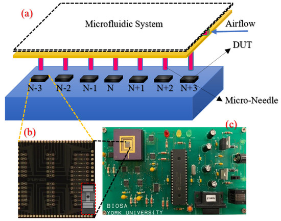 Airflow-based Force Manipulation representation for MEMS sensor characterization and testing. (a) The DUT schematics of AbFM. (b) The working principles of AbFM for microcantilevers. All components of an ATE system is shown in (a); the air-injector is the essential component of this device that should be designed at the component design of MEMS devices. At the component design level, a fluid–solid interaction analysis will be done to design the microneedles (for directing airflow) size and location on top of the MEMS die. (b) Demonstrates the AbFM system for testing the functionality of microcantilever MEMS die that includes 74 microcantilevers, modeled the same as the placement in real fabricated MEMS device.