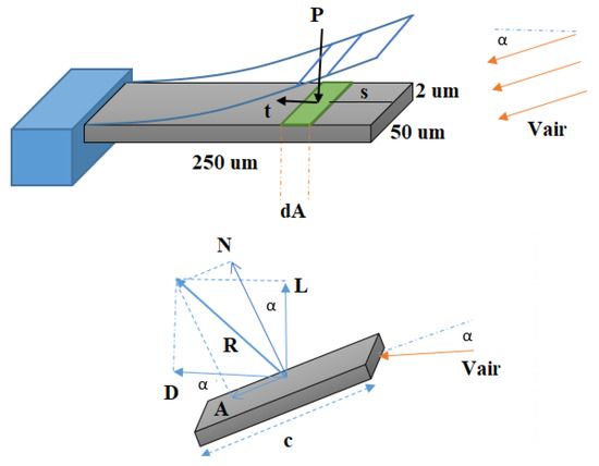 According to aerodynamics principles, when air is flowing around an object, normal pressure and shear forces act on the airfoil (here MCL) and results in aerodynamic forces and momentums. The air forces on the cantilever will be mathematically calculated as shown in Figure 5. If we suppose that the incoming airflow is moving with a velocity of V and with an α angle from the horizon (Angle Of Attack (AOA)) there are two vectors, lift force and drag force, resulting from the interaction of those important forces.