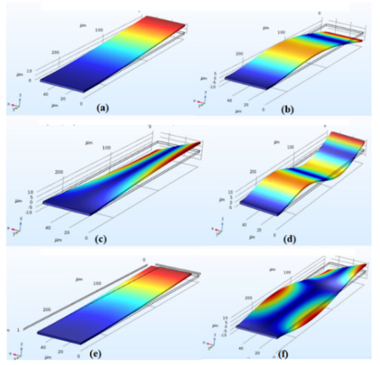 The same procedure was carried out for all MCLs in a chip with L = 400 µm, 250 µm, 100 µm, and 50 µm with all of them having the same thickness (2 µm) and width (50 µm). Figure 6 demonstrates the possible mode shapes when the frequency of the system approaches the value of the corresponding resonance frequency shown in Figure 7.