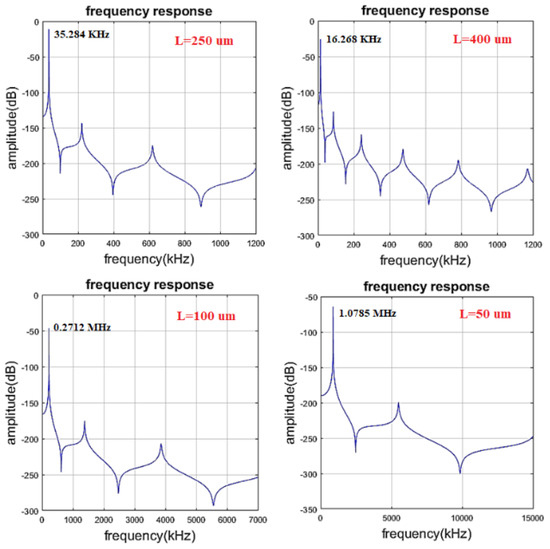 The frequency responses calculated with TSBT method for microcantilevers with W = 50 µm, T = 2 µm and L = 50, 100, 250 and 400 µm.