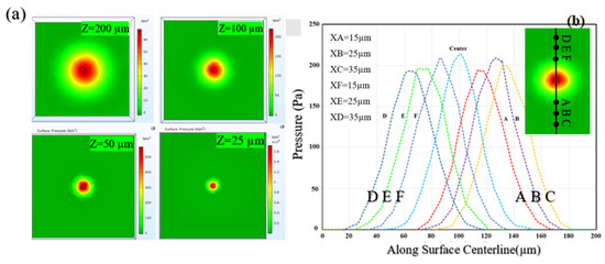 Airflow on a flat surface with a dimension of 200 µm × 200 µm. Airflow from a circular microhole with R = 5 µm and different vertical distances. (a) Airflow velocity of 10 m/s, R = 5 µm, Z varied from 25 µm to 200 µm. (b) Pressure profiles along the centerline of the surface.