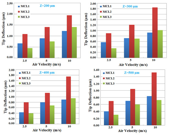 Figure 10 demonstrates the tip deflection of MCLs with L = 250 µm in the chip for different air velocities and vertical distance between microhole in the membrane to the surface of MCL. The Z distance (see Figure 8) varied from 200 to 500 µm. All the maximum deflections were under 2 µm, which was the distance between the MCLs with the substrate. Figure 10 conveys very important results that if a microhole were located along the center of the chip, all MCLs would experience different pressure from airflow and consequently different deflection. The deflection of MCLs increases as the air velocity goes up. However, the difference between the tip deflection of MCL1 and MCL3 decreases as the vertical distance between microhole increases. Therefore, the force on the cantilevers as MEMS components could be controlled with controlling the air velocity. This is a simple step toward demonstrating the fact of how the AbFM works. In the next sections, the forces are calculated in a real chip.
