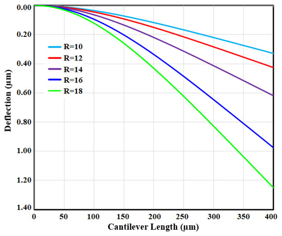 Figure 13 depicts the deflections of MCL1 for the different conditions of radii of microhole above the chip. The tip deflection for microhole radii of R = 10, 12, 14, 16 and 18 µm are 0.36, 0.42, 0.61, 0.98, and 1.22 µm, respectively. Therefore, by doing the simulation, we can estimate the flow effects on MCLs with different lengths. This could be generalized for different sensors with different moving parts, for instance, micromirrors, MEMS accelerometers, pressure sensors, etc., in the die-testing stage.