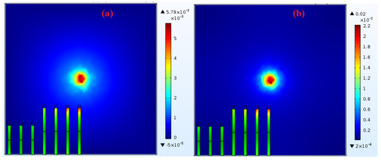 As Figure 11 represents, by using airflow as a stimulus for functional analysis of the mechanical parts of the MEMS device, the stress generated due to fluid–solid interaction on the MEMS subcomponents will be different based on the location and distance from the microhole. This could result in a different response from all microcantilevers (generally the targeted component). However, the importance of simulation is here that we want to design the system before the test. In the layout design and in the component design process flow of a MEMS device, we generated the 3D sketch of the sensor, and then the fabrication is processed. As with the concept of ASIC (Application-Specific Integrated Circuit), here we proceed with the same workflow for having Application-Specific AbFM, a MEMS ATE system design. In this process of design, the transaction mechanism of sensors and actuators will become clear and the mechanical moving objects in the system, such as microcantilevers, microplates, microneedles, comb fingers, etc., with specific geometry on the die, has gone through an AbFM fluid–solid interaction (FSI) simulation process to evaluate the MEMS components response to air pressure and trying to assess all of the contributing parameters playing a role in AbFM. Here the minimum gas velocity, the direction of focusing, the gas type, and optimization of the distance between microhole and the MEMS components will be defined with highly accurate simulation FEM, BEM software (as proceeded in this study). Then the testing requirements go through the manufacturing process and a specific testing AbFM system will be adapted to the production line of that specific MEMS component. Figure 11, at first glance, gives a view of the response of the microcantilevers device to an airflow (5 m/s), from a specific vertical distance (here 400 µm). The response of a microcantilever to airflow stimuli from a microhole placed a certain vertical distance is shown in Figure 12. The whole deflection of the microcantilever is presented.