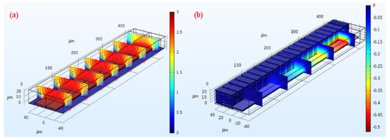 The electrostatic simulation results of a microcantilever with L = 400 µm and applying a force of 16.4 nN, which is as a result of airflow velocity V = 5m/s. (a): Electrical filed vectors; (b) Electrostatic potential with microcantilever deflection.