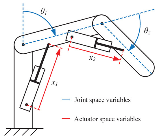 In this paper, the idea of using the actuator space in manipulator control is introduced. It revolves around using the actuators length coordinates as the state variables. This will typically be the stroke of a hydraulic cylinder, and the rotational angle of a hydraulic motor. In Figure 2, the joint space joint angles and , and the actuator space cylinder strokes and for a typical knuckle boom crane are shown.