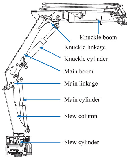 In this paper, an HMF 2020K4 loader crane has been used for experiments. This crane has a total of 5 actuators: slew cylinder, main cylinder, knuckle cylinder, telescopic cylinder, and a winch. In this case, the winch and telescopic cylinder have been omitted, leaving the system with three degrees of freedom and no redundancy which, basically, corresponds to a knuckle boom crane. An illustration of the crane is shown in Figure 3.