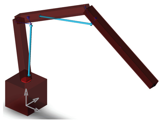 The model of the crane is a dynamic hydraulic-mechanical model. The mechanical model is a 3D multibody system, while the hydraulic model is a 1D system. The cylinders have been replaced with force elements which connect the mechanical and hydraulic model, similar to Equations (2)–(6). A 3D view of the crane from SimulationX is shown in Figure 5.