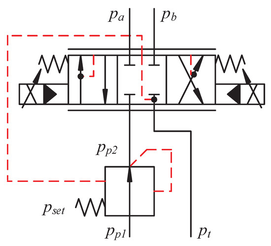The sensing of the load pressures and ensure that the pressure drop over the valve always equals , and the flow is load independent. This is shown in Equation (8).