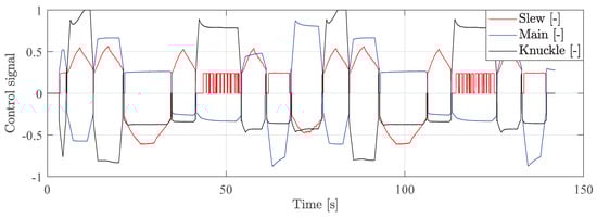 It can also be seen that the control signals are not oscillating during regular motion, which was a criterion from Section 5. At around 50 s and 120 s the control signal for the slew valve is sitting at the edge of the deadband while moving slowly, which makes it appear to be oscillating heavily. At 10 s and 80 s the control signal for the knuckle valve saturates slightly as it tries to keep up with the reference.