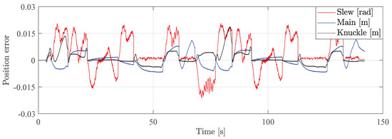 Figure 15 shows the position error for each actuator, which is less than 0.01 m for the cylinders, and less than 0.04 rad for the slew column.