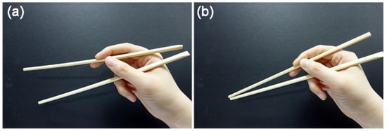 Several studies related to chopsticks have been conducted. Specifically, in regards to the effective use of chopsticks, their mechanism, optimum size, and shape have been studied [2,3,6,7]. Furthermore, virtual chopsticks driven by captured movement of a user’s hand have been demonstrated in a virtual reality system [8]. In addition, by applying the advantages of chopsticks to surgery and other research areas, new devices and techniques have been developed for grasp and transport [9,10,11,12,13].